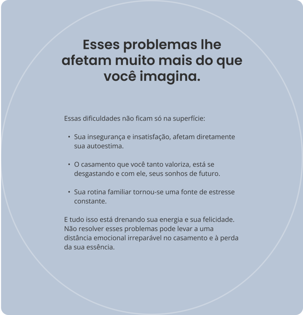 A falta de estratégias para melhorar a comunicação e o vínculo no relacionamento. Resolver essas questões exige uma abordagem mais profunda e orientada. Não é sua culpa que essas tentativas não deram certo.